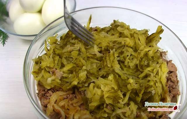 • Щільні мариновані огірочки натріть на крупній тертці, відіжміть з’явилася вологу і викладіть всередину сервіровки кільця. Рясно змастіть майонезом. Зніміть сервірувальне кільце.