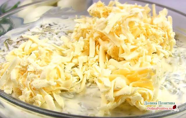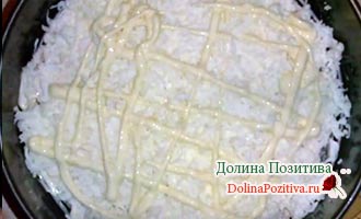 9. Наступний шар – натерті плавлені сирки. Потримайте їх у морозилці протягом півгодини. Сирки не будуть прилипати до металевій решітці терки. Процес їх подрібнення не викличе у вас труднощів. Розрівняйте шар протертих плавлених сирків, покрийте майонезній заправкою.