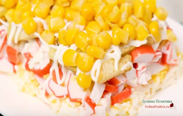 • І нарешті, консервована кукурудза. Злийте з банки рідину, а зерна розподіліть по всій поверхні листкового салату. Перед подачею на стіл дайте йому настоятися 2-3 години. Шари просочаться майонезом, закуска придбає насичений пікантний смак.