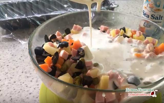 Увага! Використовуйте заправку власного приготування. За смаковими та споживчими якостями вона значно перевершує свій магазинний аналог. Рецепти заправок для святкових салатів можете знайти за посиланням.