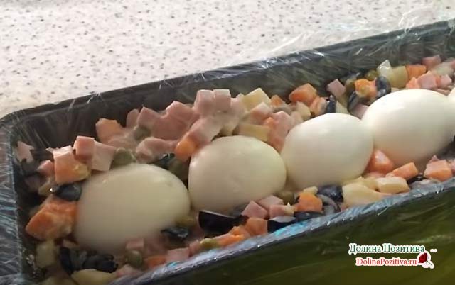 • Завершальний шар, терті курячі яйця, розрівняйте і ущільніть. Рясно змастіть майонезним соусом.