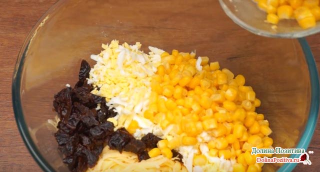 Сир і варені яйця перетріть через крупну тертку. Сир, яйця і чорнослив з’єднайте в салатнику. Додайте третину банки консервованої кукурудзи. Видавити через прес зубчики часнику. Заправте майонезом і перемішайте.