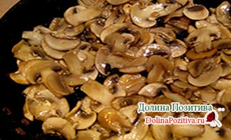 • Свіжі печериці порізати на пластинки, ріпчасту цибулину – півкільцями. Обсмажте в рослинному маслі. Рідина з грибів випарувалася? Вони готові. Остудіть.