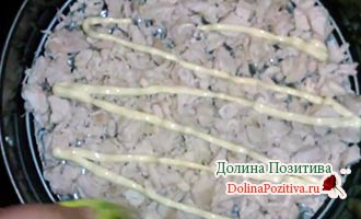 • Всередину сервіровки кільця викладіть шар курячого м’яса, змастіть майонезом.