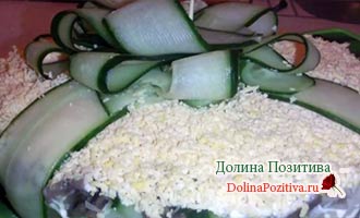 • Посипте натертим сиром. Акуратну майонезну сіточку наносити не тільки на верхню поверхню, але і на боки салату. Вона повинна створити надійну клеючу основу для останнього шару.