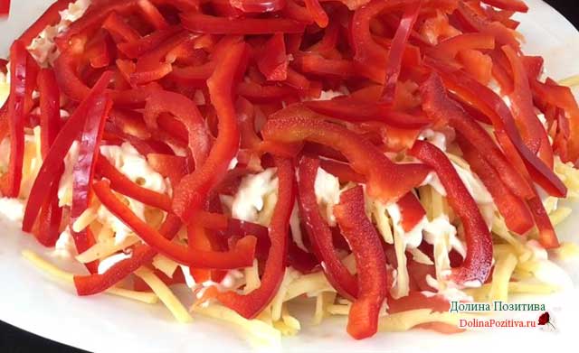 Дане блюдо класно виглядає в креманці. Яскравий апетитний вигляд супроводжується неймовірним смаком. Салат прикрасить будь-яке застілля.
