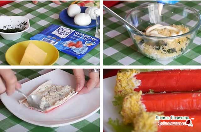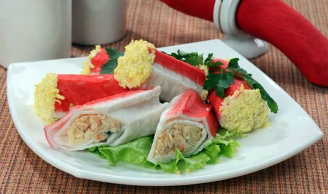 Познайомтеся з ефектною закускою з крабових паличок. Таку гріх і на Новий рік, і на ювілей не поставити. А смак — просто чарівний. Оцінять всі гості.