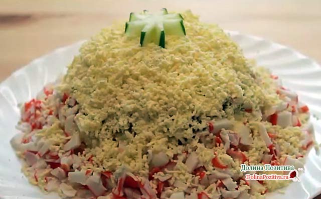 Порядок наступний: білки, сир (між другим і третім шаром просочення не потрібна), терте вершкове масло, крабове м’ясо, яблука, тертий жовток).