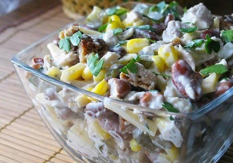 Ці продукти не зникають з полиць магазинів ні влітку, ні взимку. Саме тому, салат з кукурудзою і червоною квасолею, можна готувати незалежно від сезону. Крім того, саме такі нехитрі страви можуть виявитися як вишуканими, навіть екзотичними, так і дієтичними, придатними для тих, хто прагне схуднути. Смак же салату з кукурудзи квасолі і сухариків завжди яскравий, подача незвичайна, а аромат просто неперевершений, незалежно від того, які компоненти в ньому задіяні. Хоч у святковій атмосфері, хоч у звичайній буденній, салат без майонезу з квасолею і кукурудзою здатний підняти настрій, втамувати голод і здивувати всіх сидячих за столом своєю досконалістю.
