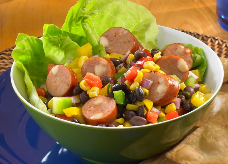 Ніжний салат з кукурудзою та квасолею рецепт – надбання Мексики, саме там його готують і цінують. Як і більшість інших страв цієї кухні, цей салатик відрізняється досить гострим, але приємним смаком. Особливість же його в ковбасках, додають не тільки ситності, але і вишуканості страви. Сподобається такий салатик не тільки любителям вогненної їжі, але і всім, кому не чуже щось нове.