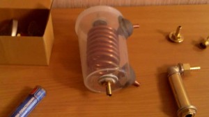 Змійовик поміщають всередину корпусу, скріплюють з пластиком зсередини суперклеєм. З торців вставляють бляшані заглушки. Залишилися між корпусом і заглушками зазори ущільнюють папером, суперклеєм.