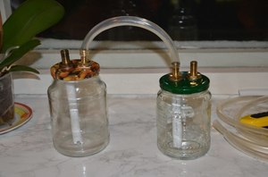 Пристрій сухопарника досить просте: його можна виготовити самостійно з скляної банки з заворачивающейся кришкою. Для цього беруть два болта М8 або М10 з гайками і силіконовими прокладками. Їх просвердлюють уздовж, перетворюючи в трубки, в кришці банки просвердлюють два отвори і вставляють туди отримані штуцери, фіксуючи гайками. Тепер досить надягти силіконові трубки і вийде відмінний сухопарник своїми руками.