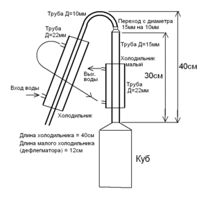 Труби спаюються таким чином, щоб одна була всередині іншого, центральну трубу впаюються знизу перехідник для приєднання до перегонному кубі, а зверху — трубка для приєднання до холодильника. До зовнішньої трубі припаюються два штуцера для підключення до холодної води. Також у верхню частину отриманого дефлегматора можна впаяти термометр. Дефлегматор для самогонного апарату готовий.