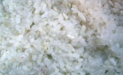- Ретельно промиваємо рис, заливаємо окропом, залишаємо на 15 хвилин. Коли крупа трохи набубнявіє, товчемо її до м’якості.
