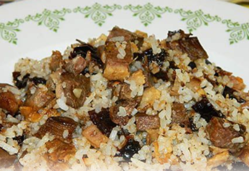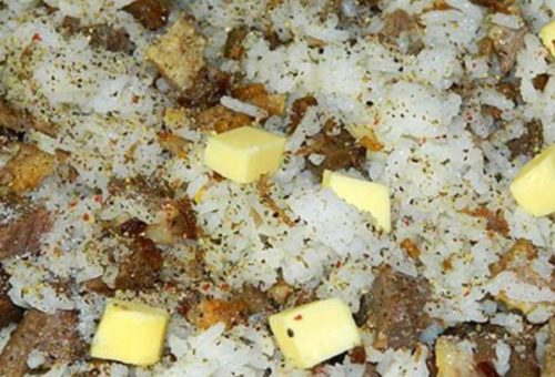 - Потім сюди ж кидаємо рис, перець свіжі мелені, сіль, третю частину масла, а через 5 хвилин кладемо нарізаний чорнослив і масло, що залишилося.