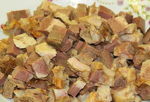 - Готове м’ясо нарізаємо середніми шматочками.