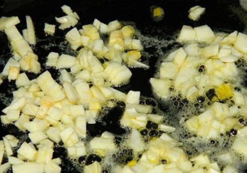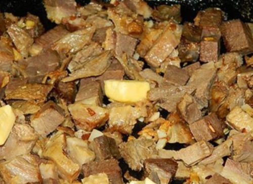 - Викладаємо на сковороду один шматочок, пасеруємо подрібнений часник, додаємо масло і м’ясо, обсмажуємо разом.