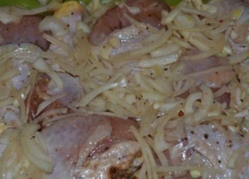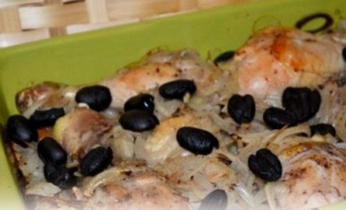 - Зверху викладаємо курку і впадемо дуже смачне пікантне блюдо до столу.