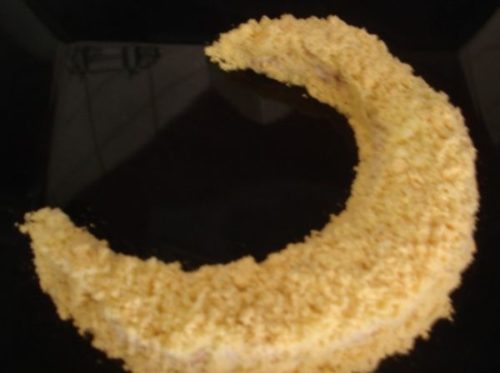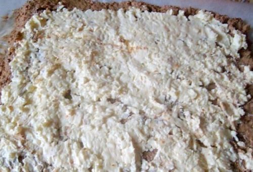 - Беремо пергаментний аркуш, зверху розкладаємо отриману суміш, а потім олійно-сирну масу.