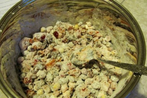 - Змішуємо підготовлені компоненти з подрібненим часником і майонезом.