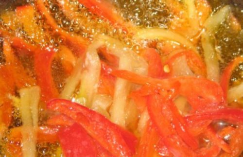 - Пасеруємо потерту моркву з цибулею, порізаною середніми брусочками в сковороді з рослинним маслом.