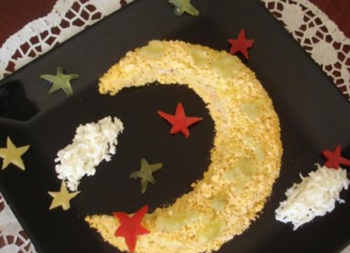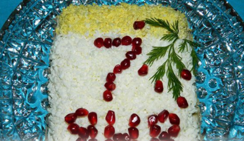 - Прикрашаємо частування жовтком, краю посипаємо білками, потертими на тертці, зображуємо зернами граната число і місяць, а ще використовуємо гілочки кропу.