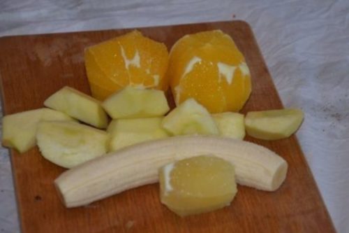 - Готуємо гарнір. Очищаємо банан, лимон, апельсин, яблука, шаткуємо гуртками.