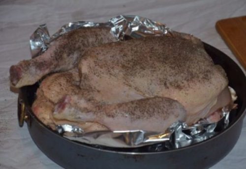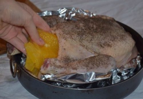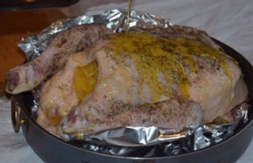 - Змащуємо птицю оливковою олією, запікаємо в духовій шафі 1 годину 20 хвилин при 180 градусах.