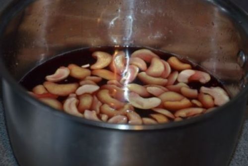 - У сотейник вливаємо вино, прогріваємо на невеликому вогні, змішуємо з цукром і кешью.