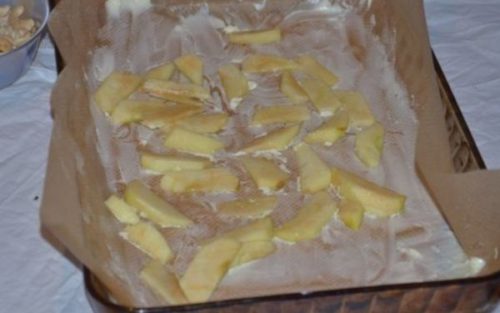 - Беремо прямокутну форму, на дно кладемо пергаментом, змащуємо маслом, вливаємо тісто, запікаємо в духовій шафі 50 хвилин при 160 градусах.
