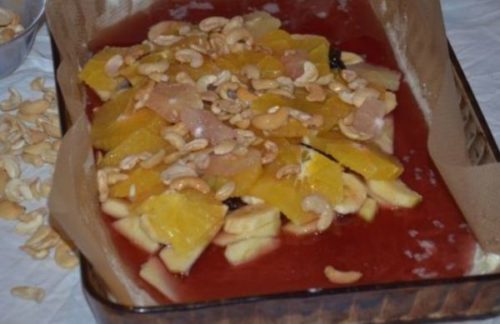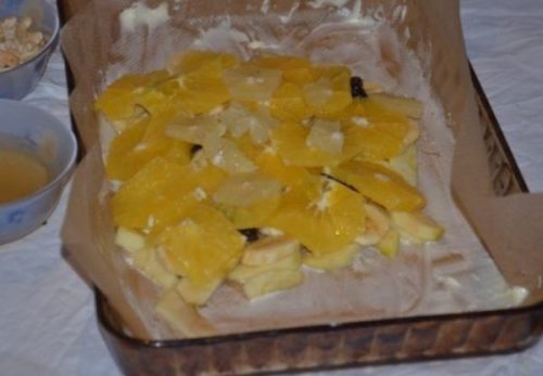 - Форму застеляємо папером, змащуємо олією, викладаємо яблука, сухофрукти, банани, апельсини, лимон, приправляємо винним сиропом, запікаємо в духовій шафі 20 хвилин при 200 градусах.