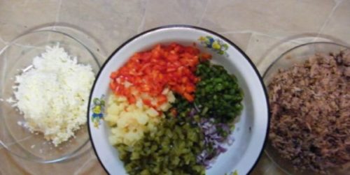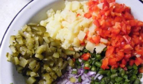 - Болгарський перець, огірки, яйця, картоплю нарізаємо шматочками.