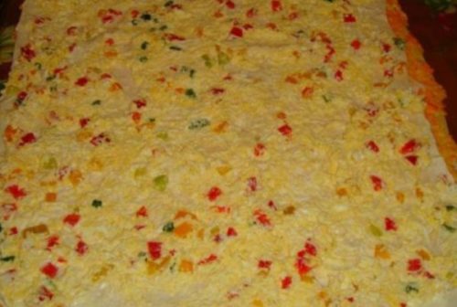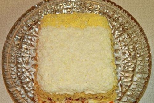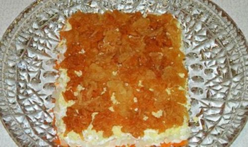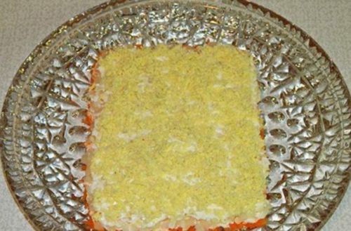 - Сиру моркву очищаємо, натираємо на тертці з дрібними отворами, викладаємо у форму, зображуючи прямокутник. Далі викладаємо салат шарами, кожен змащуємо майонезом і перший теж.
