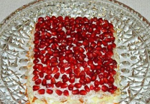 - Зверху укладаємо шар з гранатових зерен, частину залишаємо для оформлення страви.