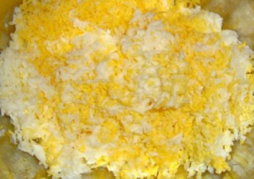 - Відварюємо яйця, остуджуємо. Жовток залишаємо для прикраси, а два жовтки тремо на тертці. Розкладаємо на цибулю.