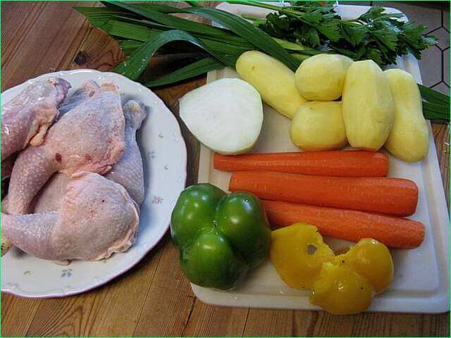 За цей час потрібно очистити, помити і порізати овочі. Лук ріжеться кільцями, а інші овочі великими шматочками.
