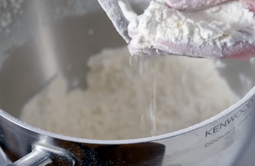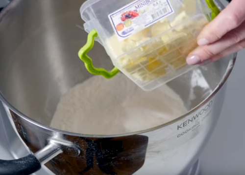 - У великій чашці з’єднуємо борошно з холодним маслом, перебиваємо блендером до стану крихти. В процесі висипаємо сіль з цукром дріжджі.