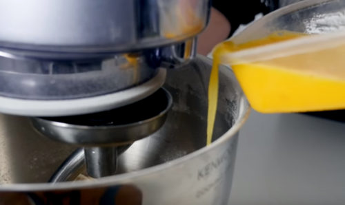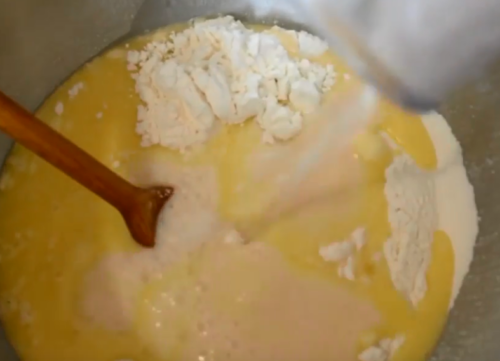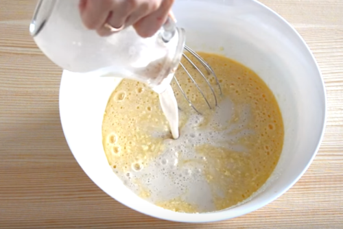 - Тонкою цівкою вливаємо підігріте молоко, таким же чином додаємо злегка збиті яйця.