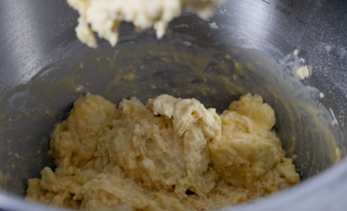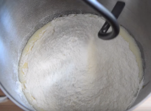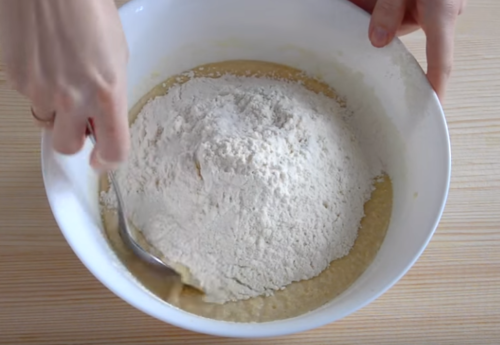 - У заздалегідь просіяне борошно вливаємо яєчно-масляну суміш, розведені дріжджі. Ретельно перемішуємо спочатку столовою ложкою, потім руками.