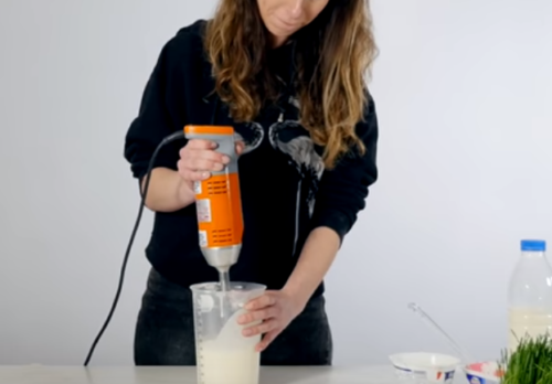 - Збиваємо за допомогою ручного блендера до однорідної рідкої консистенції маси.