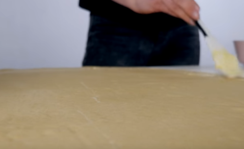 - Перекладаємо тісто на рівну поверхню, присипану борошном, трохи притискаємо і розкачуємо на тонкий пласт шириною 40 см, довжиною 60 см, товщиною не більше 5 див.