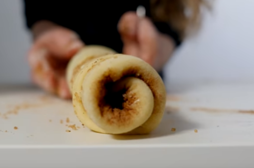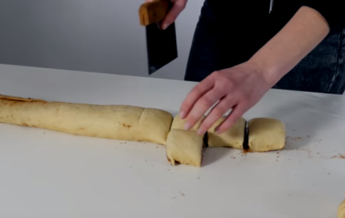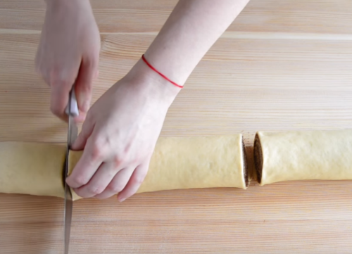 - Робимо рулет в кілька оборотів, злегка притискаючи пальцями. Краще всього, якщо їх буде якомога більше. Тоді готові булочки вийдуть ще смачніше.