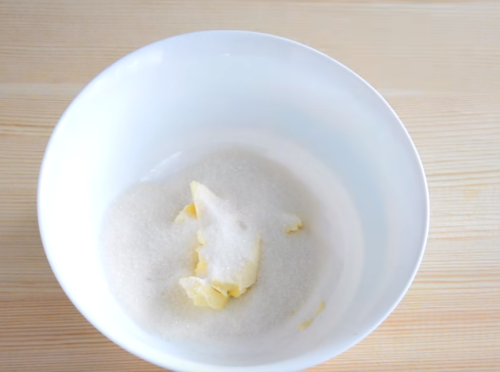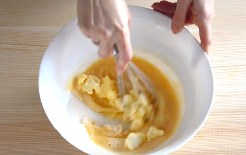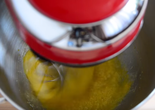 - З’єднуємо з вершковим маслом і 0,5 ст. цукру. Ретельно перемішуємо спочатку за допомогою віночка, потім використовуємо блендер.