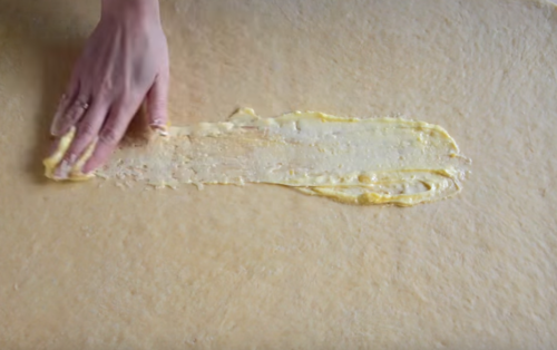 - Стіл або дошку притрушиваем борошном, зверху кладемо тісто, намагаємося його сильно не м’яти, розгортаємо в прямокутний пласт товщиною 2-3 мм.