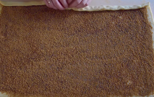 - Змащуємо розтопленим вершковим маслом. Рівномірно розсипаємо солодку суху суміш. 2 см від краю, з одного боку тесту залишаємо недоторканими.