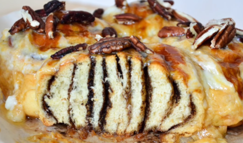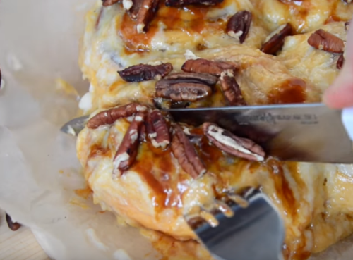- Синнабоны, приготовлені в домашніх умовах за цим рецептом з фото, поливаємо солоної карамеллю, посипаємо горіхами.