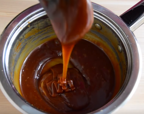 - Знову ставимо на плиту, уварюють до температури 106-107 C (знадобитися 3-5 хвилин, якщо без термометра). Трохи охолоджуємо, карамель стане більш в’язкою.