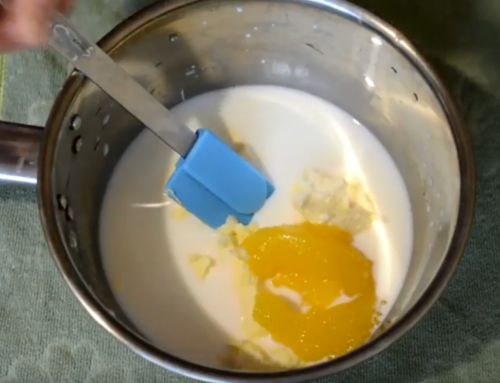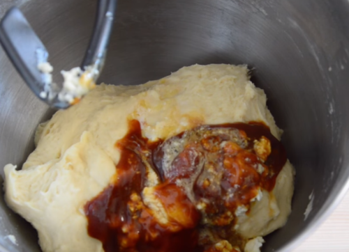 - В процесі вливаємо молоко, додаємо частинами попередньо просіяне борошно. Вимішуємо. Кладемо карамель разом з вершковим маслом.