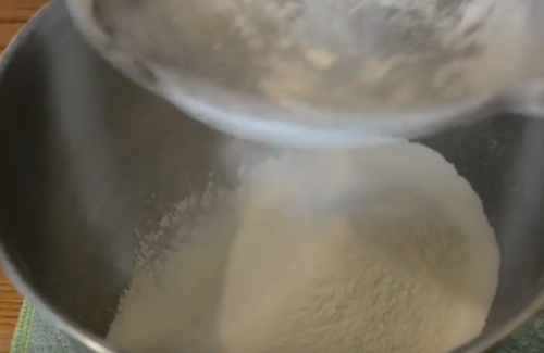 - Щоб приготувати тісто, висипаємо дріжджі разом з 1 ч. л. цукру в молоко. Заважаємо, поки відставляємо на 10 хвилин.