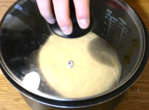 - Дно і стінки глибокої посудини змащуємо рослинним маслом. Кладемо туди тісто, щільно накриваємо харчовою плівкою, залишаємо підніматися в теплому місці приблизно годину. Цього часу вистачить, що воно добре піднялося.